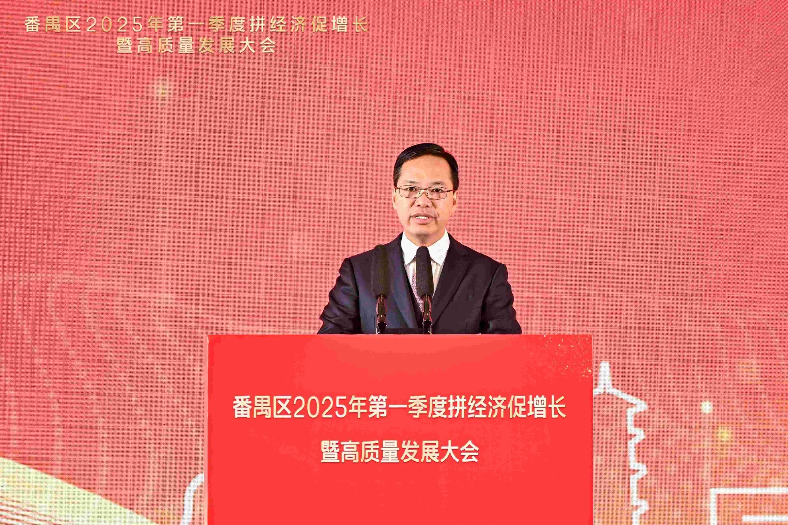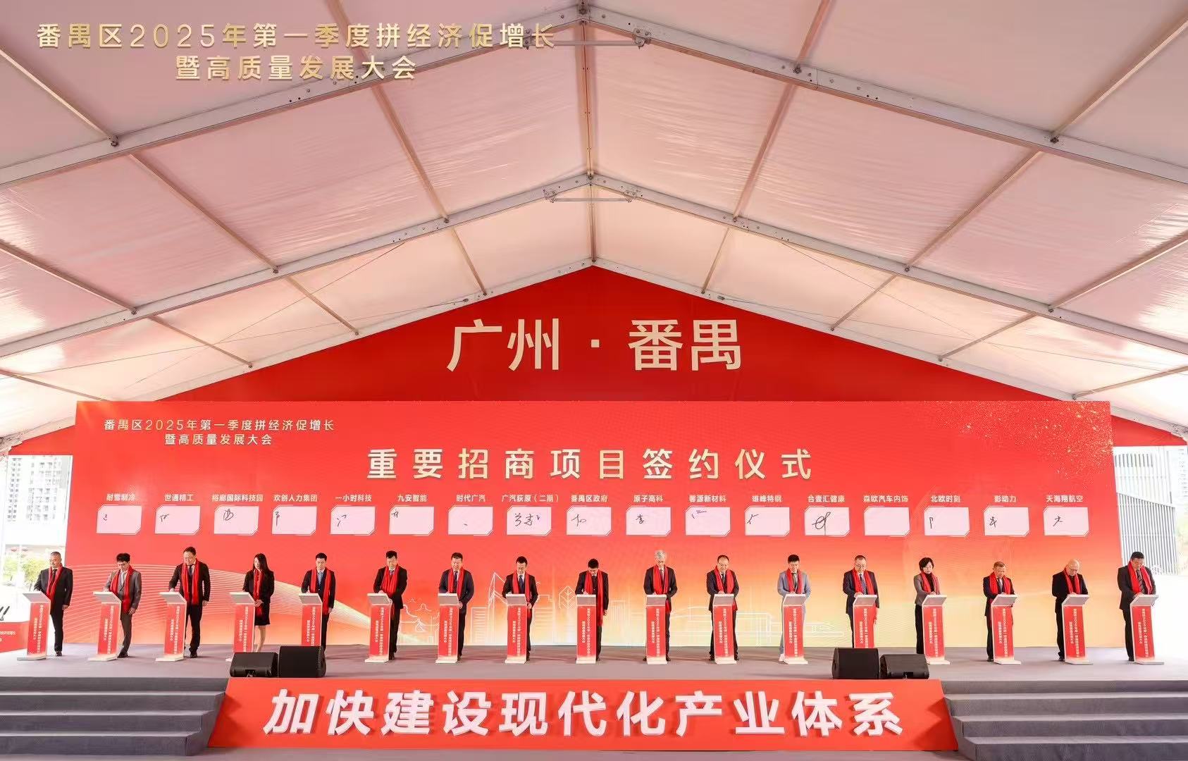珠江潮涌千帆竞,春风浩荡万象新。2月7日,番禺区2025年第一季度拼经济促增长暨高质量发展大会召开,会议由番禺区委副书记、区长叶珊瑚主持,来自番禺区领导班子、各单位主要负责同志、民主党派负责人、镇街党政领导、企业经营者代表、各行业及商会代表,以及高校和产业经济领域的专家学者等300余位嘉宾齐聚一堂,共谋发展大计。会上举行第一季度重点项目动工、竣工、投产仪式。包括欢创集团总部大厦项目在内的14个项目正式启动,总投资额达78亿元,项目达产后可实现年产值157亿元,年税收7.1亿元,开年即展现番禺区奋勇当先、大干实干的奋进姿态,力争以第一季度“开门红”引领高质量发展“全年胜”!
